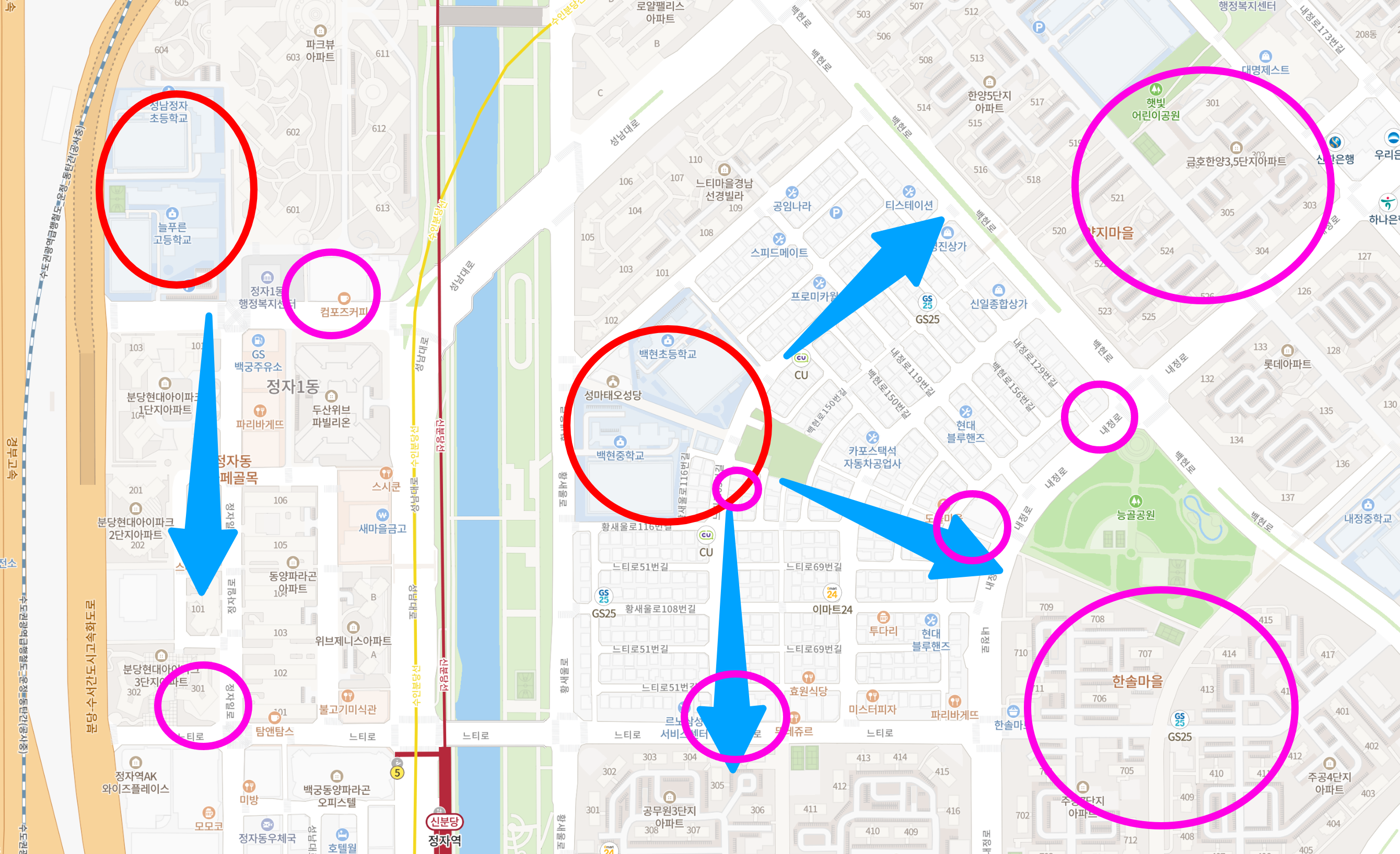 아래는 분당을예로 든 상가위치 시뮬레이션이다. 파란색은 학생들의 이동 동선이라 생각하고, 아파트 단지로 가는 길목을 가정 해봤다.